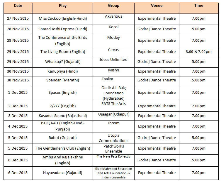 - Festival highlights : The Living Room by Kalki Koechlin, Miss Cuckoo by Akvarious Production, Kasumal Sapno by Ujaagar Dramatic Association, (Jaipur) Production, 7/7/07 directed by Faezeh Jalali, Sharad Joshi Express directed by Mayank Pahwa, The Conference of the Birds directed by Heeba Shah