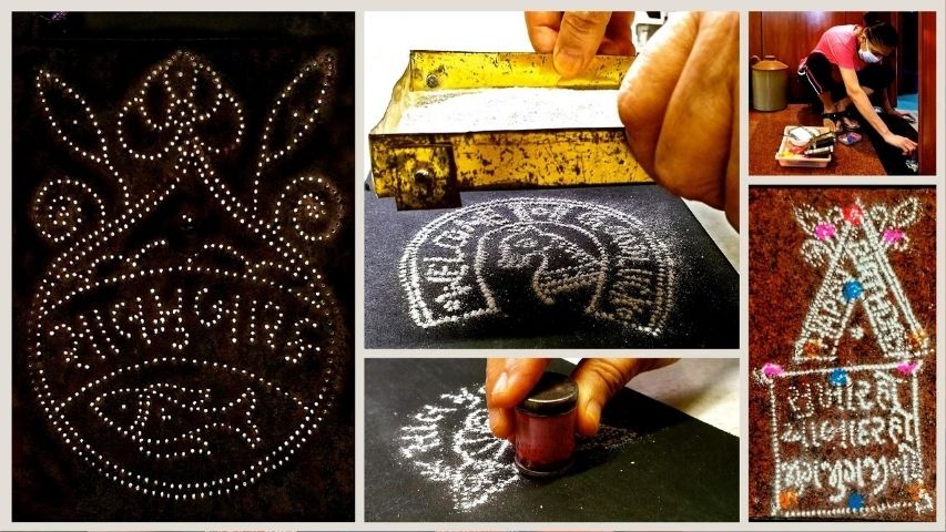 Parsis use perforated lightweight metal chalk boxes into which white chalk powder is put and stamped on the damp floor. A dash of red, orange, pink, green and yellow chalk colours are added to enhance the patterns. The designs are mostly floral with symbols of good luck; fish, horseshoe, swastik and the kalash. Quotes in English and Gujarati like “Shubh Labh" and "Good Luck" are also common.