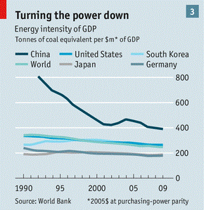 The country’s energy use is similarly gargantuan. This is in part because, under Mao, the use of energy was recklessly profligate. China’s consumption of energy per unit of GDP tripled in 1950-78—an unprecedented “achievement”. In the early 1990s, at the start of its period of greatest growth, China was still using 800 tonnes of coal equivalent (tce, a unit of energy) to produce $1m of output, far more than other developing countries. Energy efficiency has since improved; China used 390tce per $1m in 2009. But that was still more than the global average of 300tce and far more than Germany, which used only 173tce.