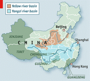 The worst problem is water. Pictures of China often show green and watery landscapes. But most of northern China is as dry as straw. “Severe water stress” is usually defined as access to less than 1,000 cubic metres of water per person per year. For China the figure is just 450 cubic metres. The national average is bad enough but it hides an even more alarming regional disparity. Four-fifths of the water is in the south—mainly in the Yangzi river basin (see map). Half the people and two-thirds of the country’s farmland are in the parched north—mainly in the Yellow river basin. In Beijing there is just 100 cubic metres per person per year. The water table there has fallen by 300 metres in two decades. Wen Jiabao, a former prime minister, was barely exaggerating when he said water shortages “threaten the very survival of the Chinese nation”.