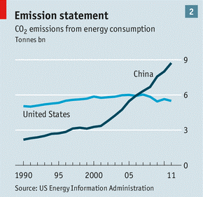And there is something else in the air, less immediately damaging but with a far bigger global impact. China’s greenhouse-gas emissions were about 10% of the world’s total in 1990. Now they are nearer 30%. Since 2000 China alone has accounted for two-thirds of the global growth in carbon-dioxide emissions. This will be very hard to reverse. While America and Europe are cutting their emissions by 60m tonnes a year combined, China is increasing its own by over 500m tonnes. This makes it a unique global threat.
