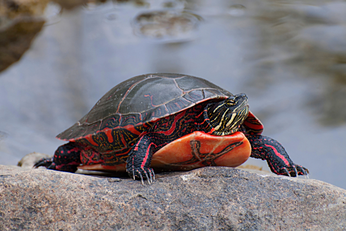 The western painted turtle is one of the four recognized subspecies of the painted turtle in North America. These subspecies are delineated based on the geographic separation of different species populations. People consider painted turtles some of the most attractive turtles, making them popular in the pet trade. Their smooth dark upper shells are accented with bold red or yellow borders, and they have bright red or yellow stripes on their legs, tails, and necks. Of the four subspecies, western painted turtles are the largest, growing to between 4 and 10 inches long. Western painted turtles also boast the most intricate coloured patterns of any of the subspecies.