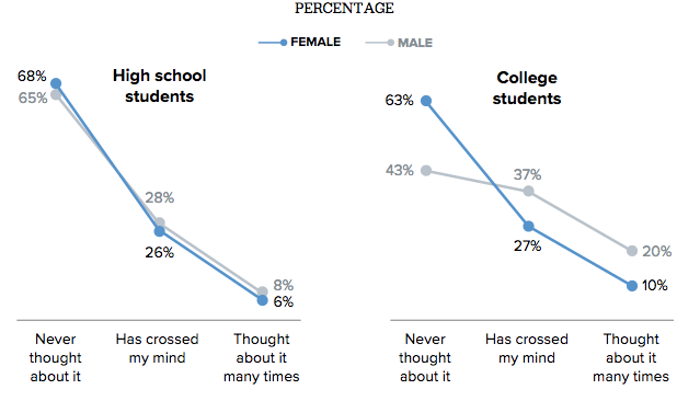 Note: Data are based on responses from 903 high school boys and 915 high school girls, all of who plan to attend college, and 1,020 college men and 1,095 college women. The gender gap is only statistically significant at p < .05 in all comparisons between college men and women.