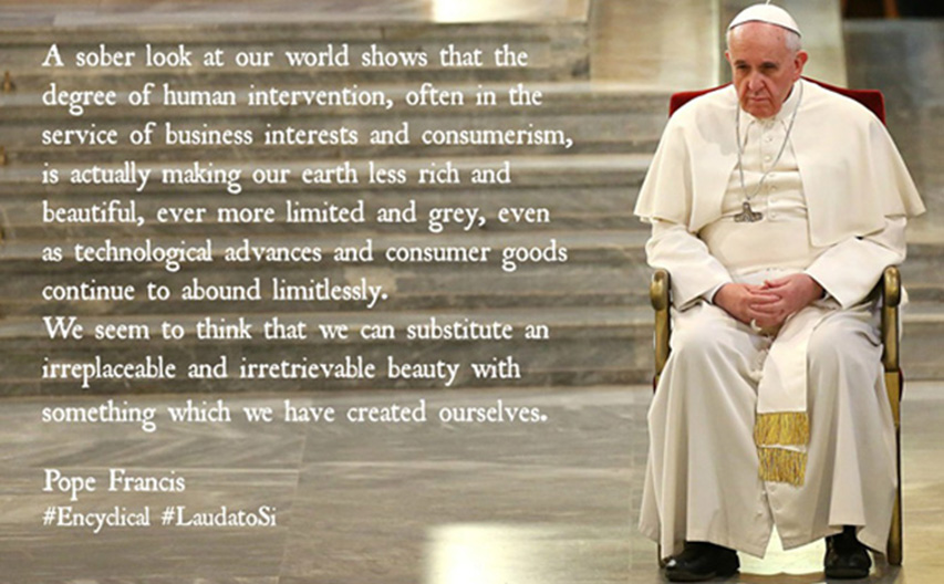 Our activities are making our earth less rich and less beautiful. According to the Pope “the alliance between the economy and technology ends up sidelining anything unrelated to its immediate interests. The Pope criticises consumerism and irresponsible development, and calls for “swift and unified global action” to combat environmental degradation and climate change (also known as global warming).