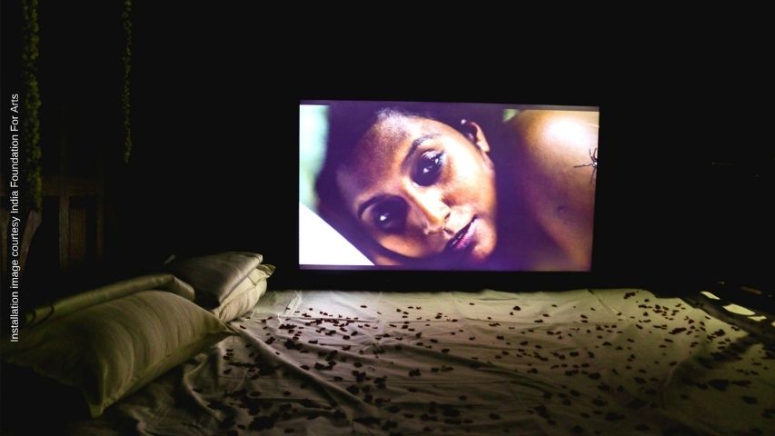 Interestingly, this artwork is conceived as both an installation and an independent film. And, the installation adds the gothic touch with its rather diabolical title ‘The Nuptial Chamber.’ It literally reproduces the wedding chamber where there is a centrally placed cot adorned with flowers and the LCD screen is placed next to the cot. The traditional maniyara in Malayalam is transformed into a space where the bride invites the visitor to listen in. By categorizing her film as a documentary, Ranjini avers that she is complicating our notions of reality. She plays with our understanding of representations and the very representability of certain lived experiences.