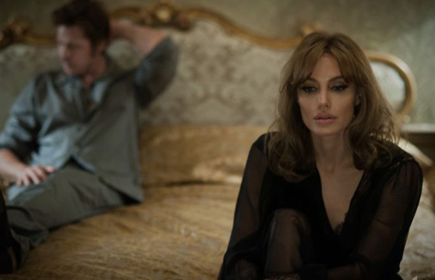 And so Vanessa weeps and she weeps, sometimes while framed in a window of the hotel and generally while dressed in one of her black or white negligees. Working with the excellent cinematographer Christian Berger, Ms. Jolie Pitt seems to be giving her audience exactly what it demands, on screen and off: herself. In medium shots and close-ups, in daytime and night, she turns her face and body (or rather Vanessa’s) into a landscape of classic feminine suffering, becoming our latest cinematic lady of perpetual misery. In one shot, Vanessa stands at a window smoking, her eyes hidden behind her oversize Yves Saint Laurent glasses; in another, she sits on a bed, eyes shiny and unfocused; in another, she stretches out catlike on a chair until her body fills the frame from coifed head to perfect toe.